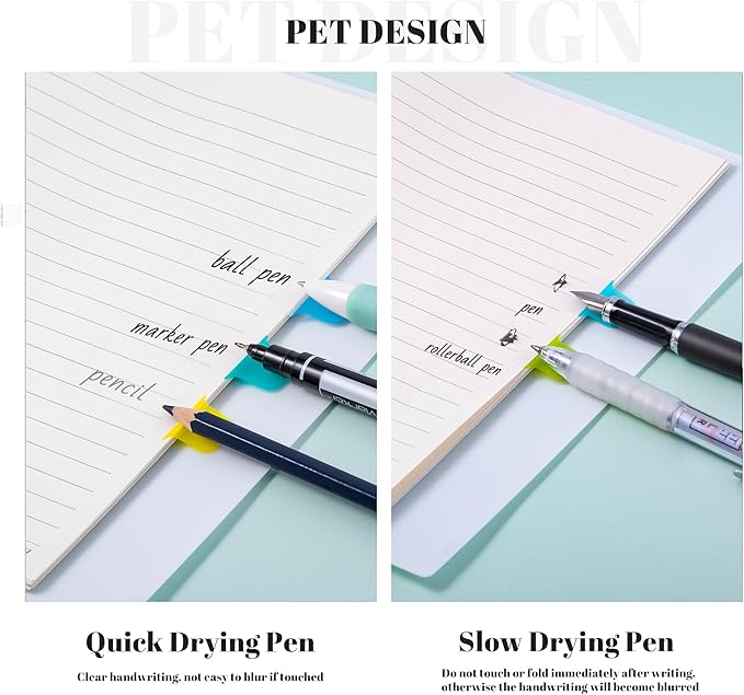 - [WATERPROOF PET MATERIAL] Tear-resistant film prevents ink bleeding and smudging. Withstands liquid spills and frequent page turning with reinforced adhesive edges.