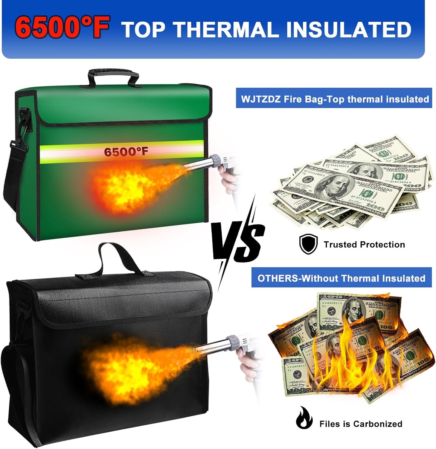 - ⚠️ (Note) Fireproof doesn't mean it can withstand prolonged fires, and waterproof doesn't mean it can withstand prolonged immersion in water; it simply means it can prolong your rescue time. ✅Ultimate Fireproof and Waterproof: This upgraded SGS UL94-certified important document storage box is made from thickened silicone-coated fireproof cotton and aluminum foil. The fully enclosed flip-top design provides seamless fire protection and can withstand temperatures up to 6500°F.
