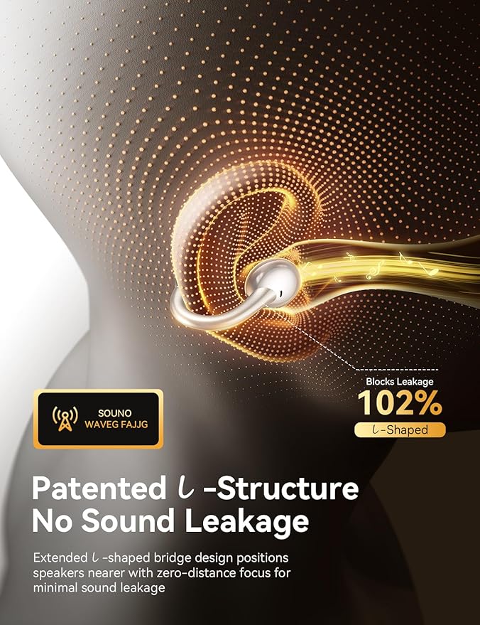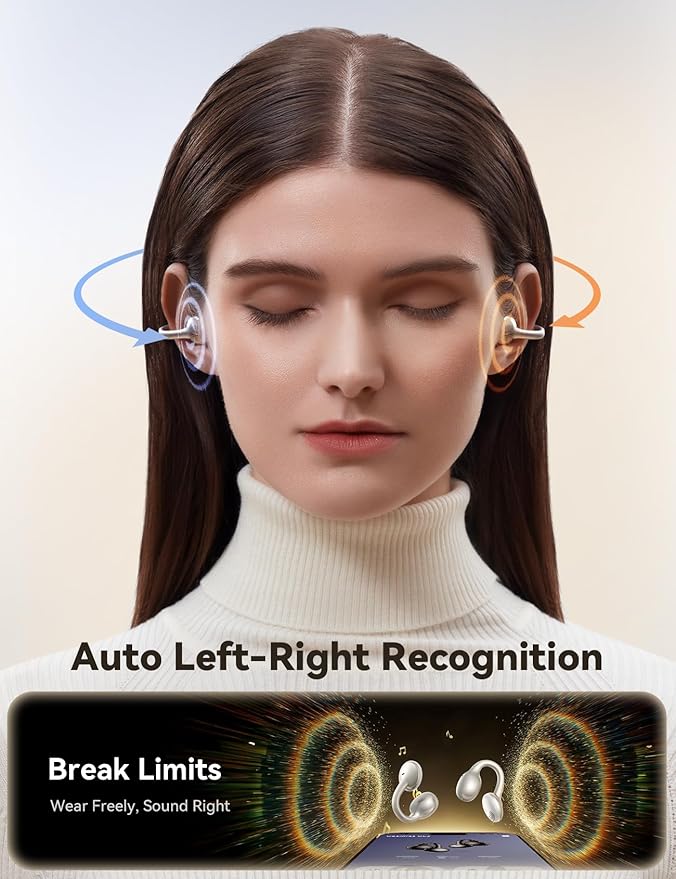 - 【All-Day Comfort】Enjoy superior sound and lasting comfort with our L-shaped open ear clip on design. By positioning the bluetooth earbuds closer to the ear canal, they deliver clearer, more precise audio while minimizing sound leakage. The open-ear style ensures all-day comfort and keeps you aware of your surroundings—perfect for workouts or daily use. Crafted from high-elastic, skin-friendly silicone and weighing only 4.9g, these clip on earbuds offer a secure, ultra-light fit. Whether you're running, working, or relaxing, the ergonomic design stays comfortably in place—even during extended wear