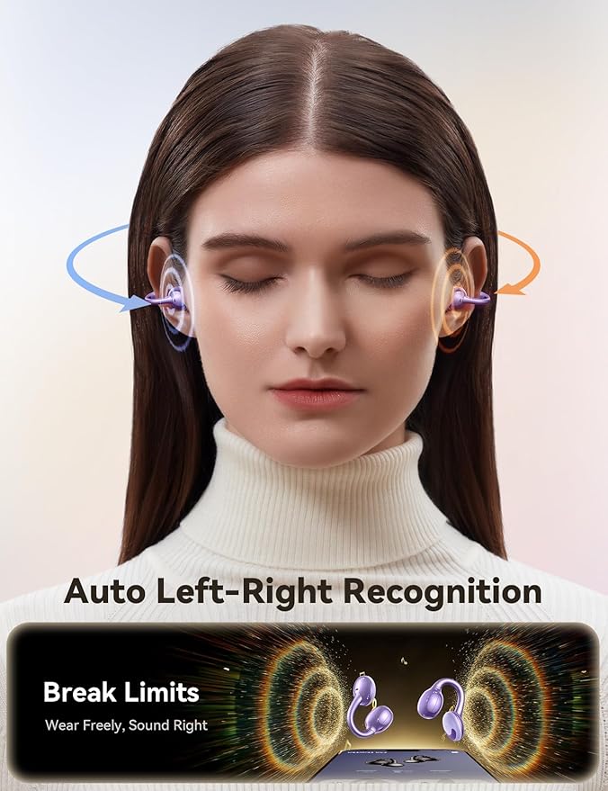 - 【All-Day Comfort】Enjoy superior sound and lasting comfort with our L-shaped open ear clip on design. By positioning the earbuds closer to the ear canal, they deliver clearer, more precise audio while minimizing sound leakage. The open-ear style ensures all-day comfort and keeps you aware of your surroundings—perfect for workouts or daily use. Crafted from high-elastic, skin-friendly silicone and weighing only 4.9g, these clip on earbuds offer a secure, ultra-light fit. Whether you're running, working, or relaxing, the ergonomic design stays comfortably in place—even during extended wear