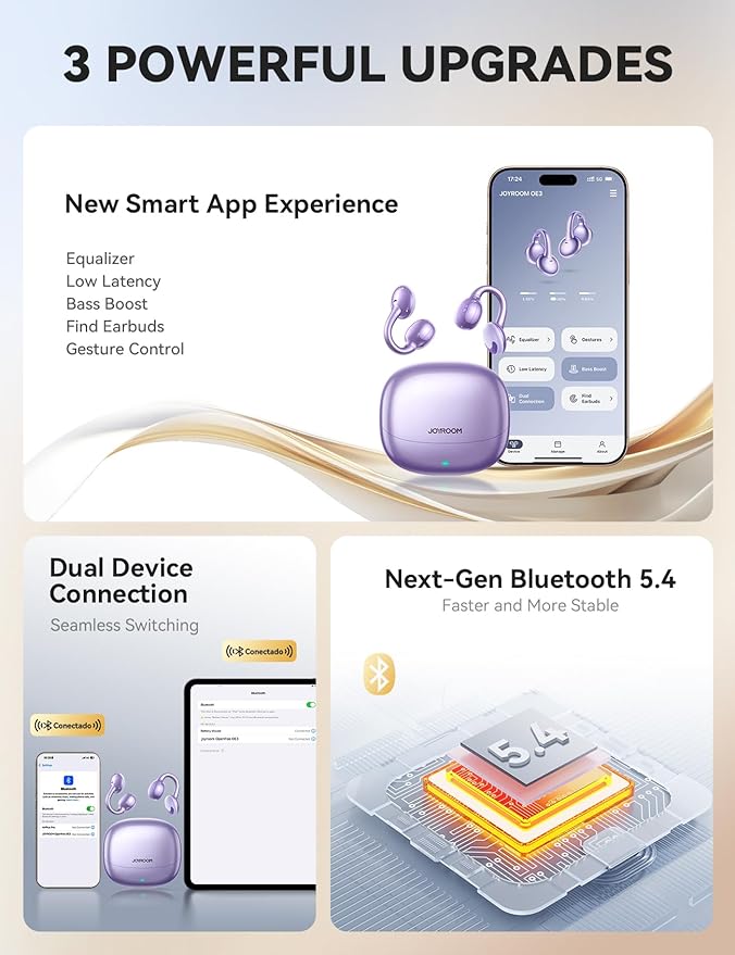 - 【Personalized Audio App】Take full control of your listening experience with the JOYROOM Audio App. Customize touch controls, fine-tune EQ settings, and boost bass with low-frequency enhancement—all in one place. The app also features “Find My Earbuds” to help you locate your OE3 wireless bluetooth clip earbuds in seconds. Turn on Low-Latency Mode for perfectly synced audio and visuals, delivering a smoother, more immersive experience when gaming or watching videos. Plus, dual-device Bluetooth support lets you seamlessly switch between your phone and laptop for added flexibility