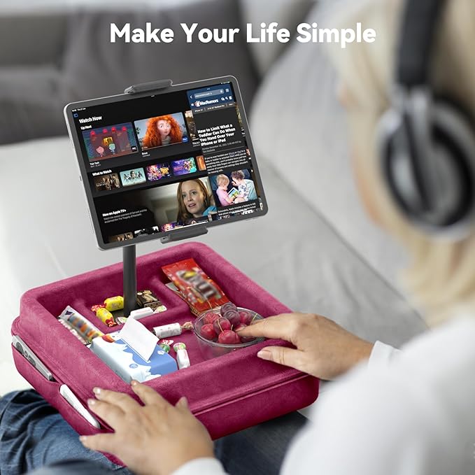 - 【 Large Storage Tray】Our pillow tablet stand is designed with a large capacity tray which can hold fruits, snacks or cell phones, remotes, headphones or glasses so you can grab a snack and enjoy it while watching a video; and there are different pockets on both sides of the Pillow Stand designed to hold pens or other small items.
