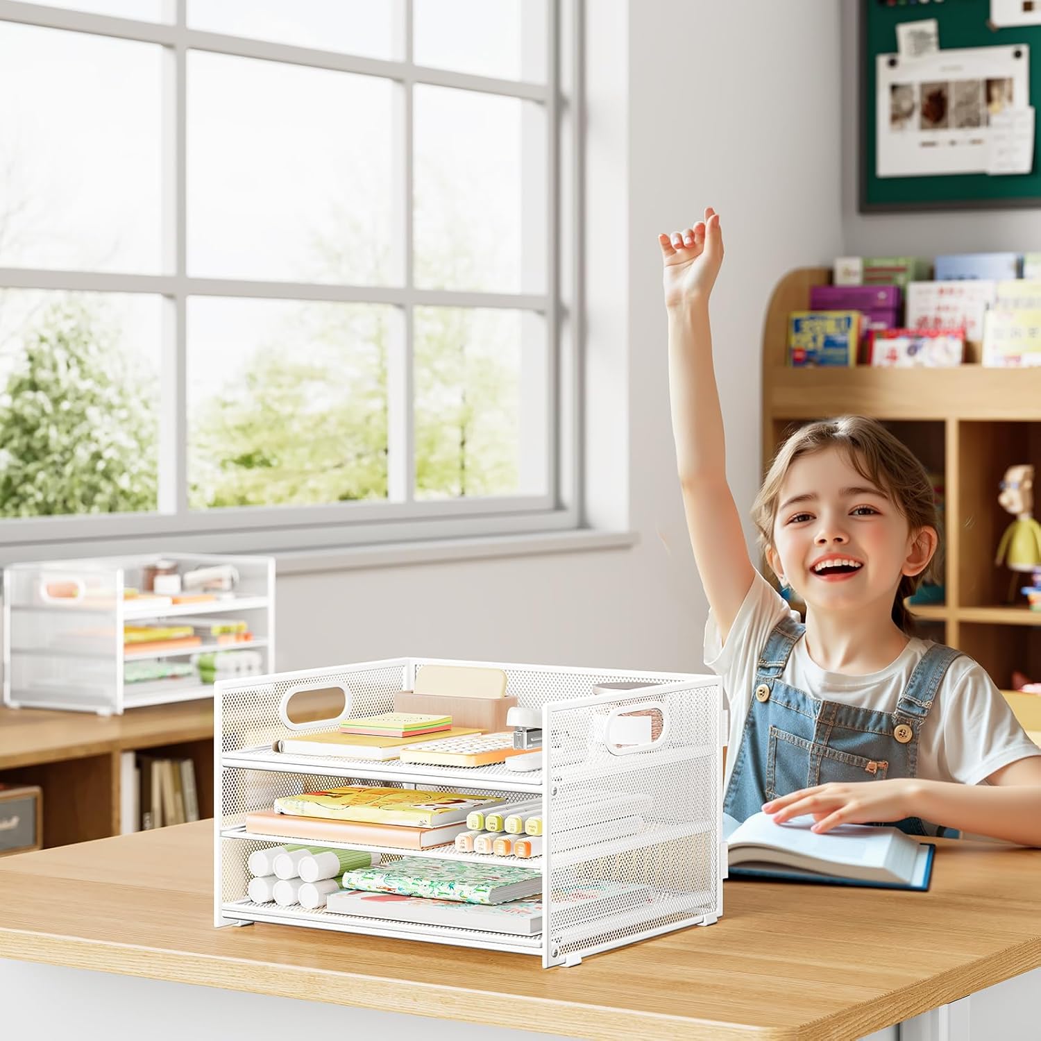 Subekyu 2-Pack 3-Tier White Metal Mesh Desk Paper Letter Tray & File Sorter Organizer with Handle + 1 Sliding Tray for Desk, Home, Office, School Supplies, A4 Paper and Accessories Storage