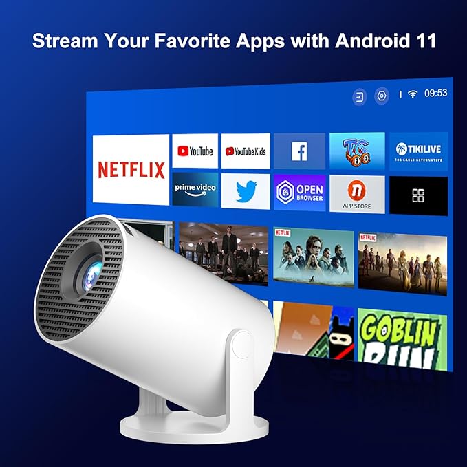 - This smart projector with built-in apps runs on Android 11 — allowing you to download N+, Prime Video, YouTube, and more with just one click. It comes pre-installed with the Google Play Store and an app store, offering access to over 10,000 apps for seamless online streaming, web browsing, and smooth app performance. 【Note: If the system prompts that the app is incompatible, pls uninstall it and re-download it from the App Store. If it still does not work, pls feel free to contact our customer service and we will help you solve it together.】
