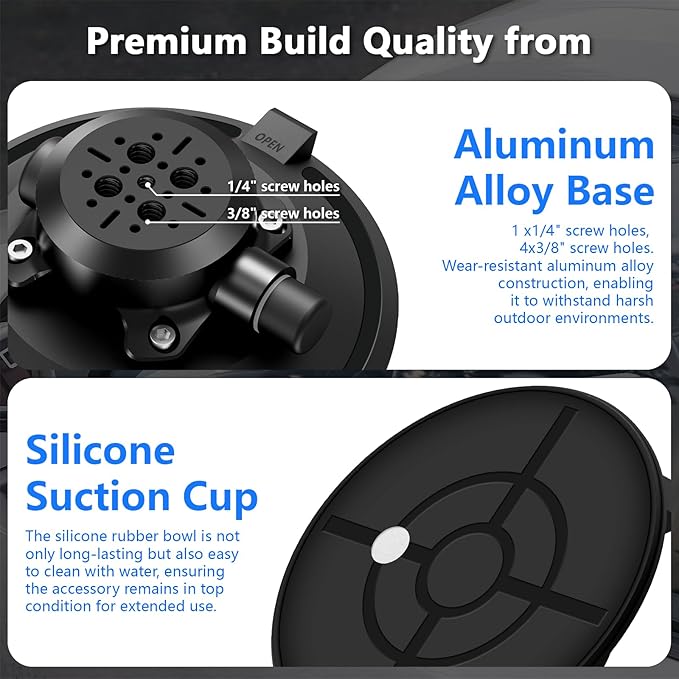 - Premium Quality:CAMEDAFLX suction cup kit is Crafted with durability in mind, the suction cup holder features a rigid and wear-resistant aluminum alloy construction, enabling it to withstand harsh outdoor environments. The silicone rubber bowl is not only long-lasting but also easy to clean with water, ensuring the accessory remains in top condition for extended use.