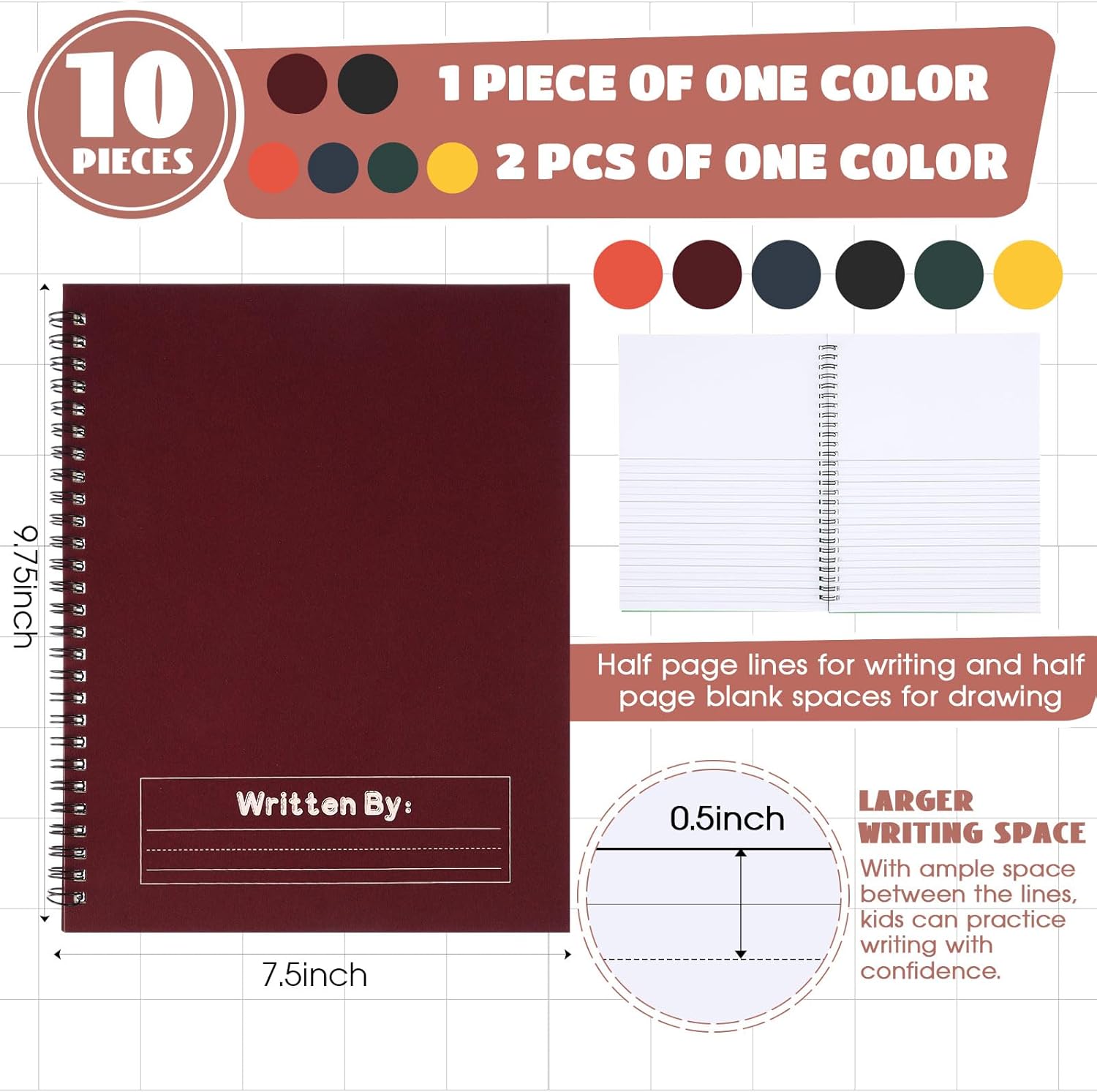 Henoyso 10 Pcs 100/50 Sheets Primary Composition Notebook K-2 Bulk Spiral Primary Journal Drawing Handwriting Practice for Kids Kindergarten 1st 2nd Back to School Supplies (Jewel Tone Color,50 Sheets)