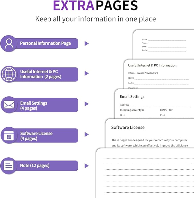 - 【Plenty of Space for Information】Our small pocket password book with 3 entries per page, and it can contain over 414 passwords. There are additional pages: Useful Internet & PC Information (2 pages), Email Settings(4 pages), Software License(4 pages), and Notes(12 pages). We have reserved a place to write a password hint instead of the password itself to ensure password security.