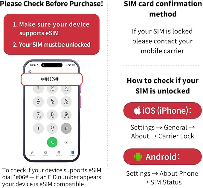 - 【Check Device Compatibility Before Purchase】 This service is only available for eSIM-compatible and SIM-unlocked devices. Dial *#06# — if an EID number appears on the screen, your device supports eSIM functionality.