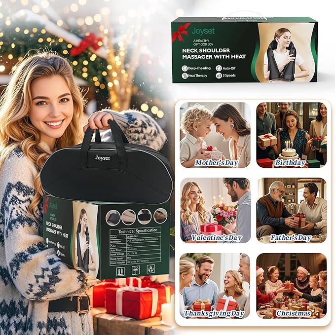 Joyset Shiatsu Neck and Back Massager with Heat,Shoulder Massager for Pain Relief Deep Tissue, 3D Kneading Massage with Cloth Cover,Carry Bag,Best Gifts for Men Women Parents