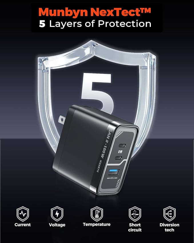 - Safety & Durability: MUNBYN NexTect 100w gan charger with 5-layer protection actively keeps devices cool and ensures steady operation, providing long-term reliability