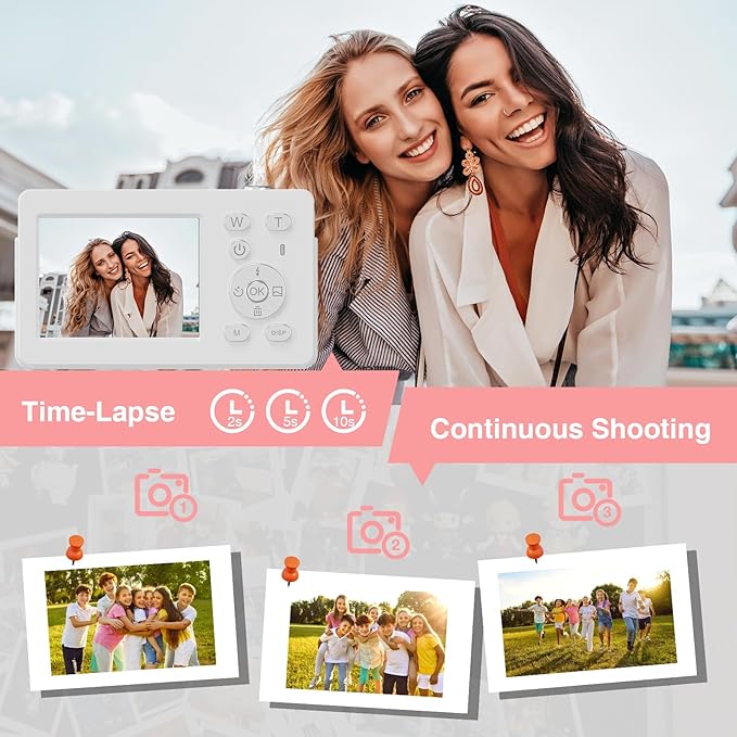 - 📷2.8" Screen Dual Cameras: Point and shoot style digital camera with a 1.4″ front display and a 2.8″ rear screen for framing perfect selfies and vlogs. Playful photo effects and filters add extra fun to every image. Time-lapse,slow-motion,face/motion detection, self-timer and continuous shooting add creative flair.