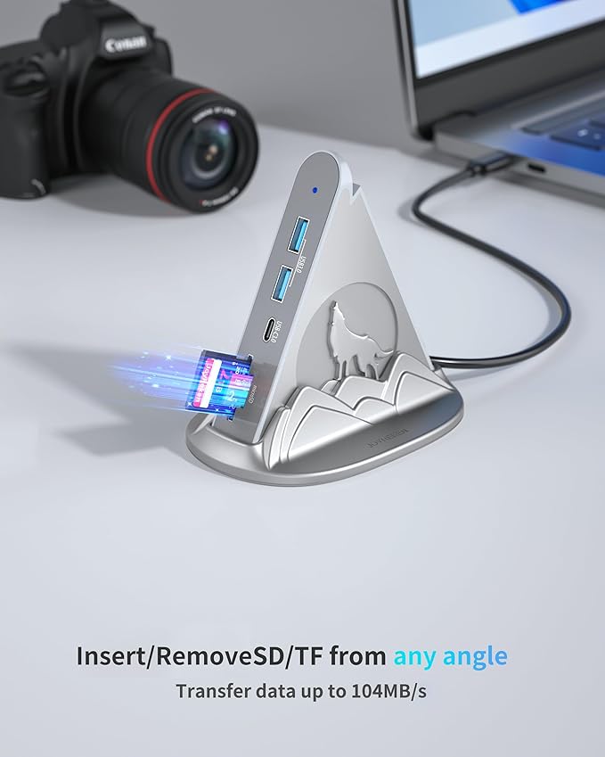 - Blazing-Fast Data Transfer:Say goodbye to slow file transfers. With 3 USB 3.0 Type-A ports and 1 USB-C port, this USB-C vertical dock delivers speeds up to 5Gbps—transfer a 1GB file in 3-5 seconds. The independent SD and microSD card reader support simultaneous read/write at speeds up to 104MB/s, making it a must-have for photographers, videographers, and designers.