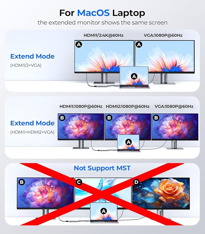 - [ Docking Station 3 Monitors with Ultra High-definition 4K Output ]: usb c hdmi hub for multiple monitors adapter with dual HDMI ports and VGA outputs. While single use HDMI port resolution up to 4K@30Hz, single use VGA up to 1080P@60Hz. Dual monitors will be 4K@30Hz and 1080P@60Hz(DP1.4). Triple monitors will be 3*1080P(DP1.4). When dp1.2, one monitor of the resolution will less than 1080P. ▶Note:The computer docking station Not Support Using Converter