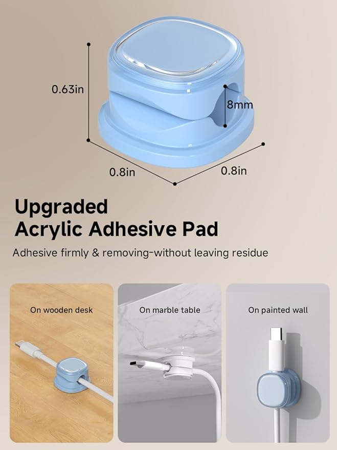 - No-Residue Acrylic Adhesive : Unlike ordinary adhesive tapes, our cable holder organizer utilizes the acrylic adhesive that is stronger and leaves no residue and won't damage your desk / nightstand or walls when removed. Just simply stick the wire holder organizer to any smooth and dry surface, such as wooden table, glass, or ceramic tiles, etc