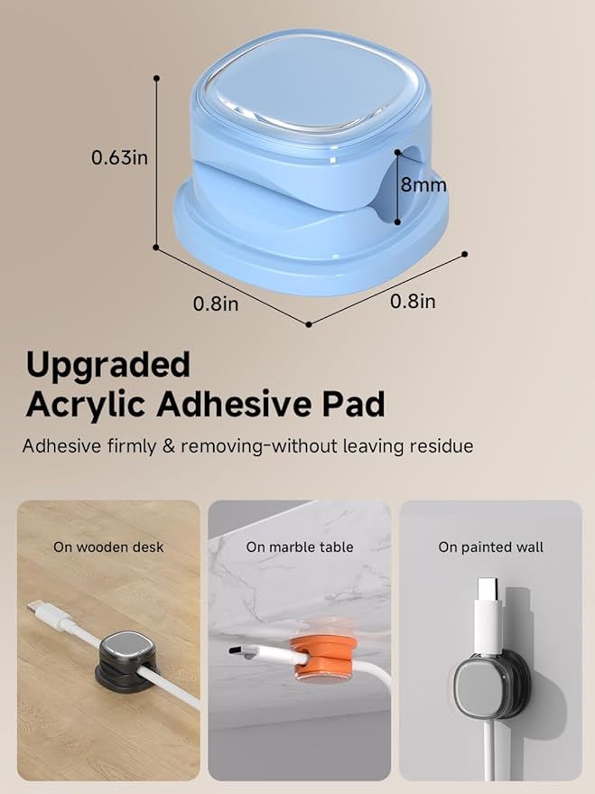 - No-Residue Acrylic Adhesive : Unlike ordinary adhesive tapes, our cable holder organizer utilizes the acrylic adhesive that is stronger and leaves no residue and won't damage your desk / nightstand or walls when removed. Just simply stick the wire holder organizer to any smooth and dry surface, such as wooden table, glass, or ceramic tiles, etc