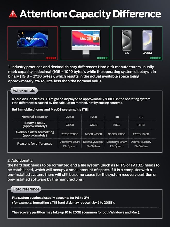 - 【Attention】--The 512GB hard drive you purchased is calculated by the manufacturer in decimal (1TB=1000GB), but the computer displays it in binary (1TB≈1024GB), so the system will show approximately 476GB. In addition, formatting will occupy a small amount of space, and the final available capacity is approximately between 465GB and 476GB. This is a normal phenomenon for all hard disks and not a quality issue. The same is true of international brands.