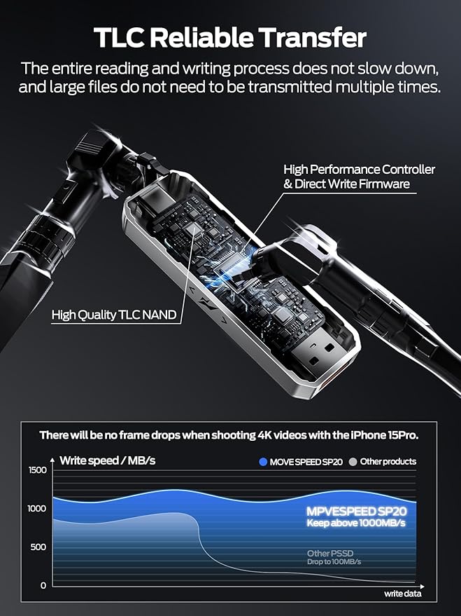 - 【4K ProRes】MOVE SPEED SP20 SSD provides 4K 60Hz ProRes HDR video capture for iPhone 17/16/15 series. This portable SSD can easily run on a variety of mobile devices, ensuring that it is always available in your pocket. (Device must support 4K, such as iphone15 Pro or later)