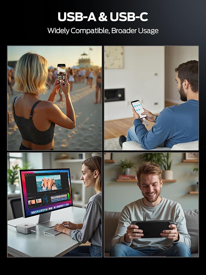 - 【Dual Interfaces】The USB A (1000MB/s)interface is for computers, and the type-C (2100MB/s) interface is for mobile phones (iPhone 15pro) or computers. Dual interfaces make data transfer between different devices more convenient, thus freeing you from cables and software, allowing you to easily switch storage Spaces and no longer worry about storage issues