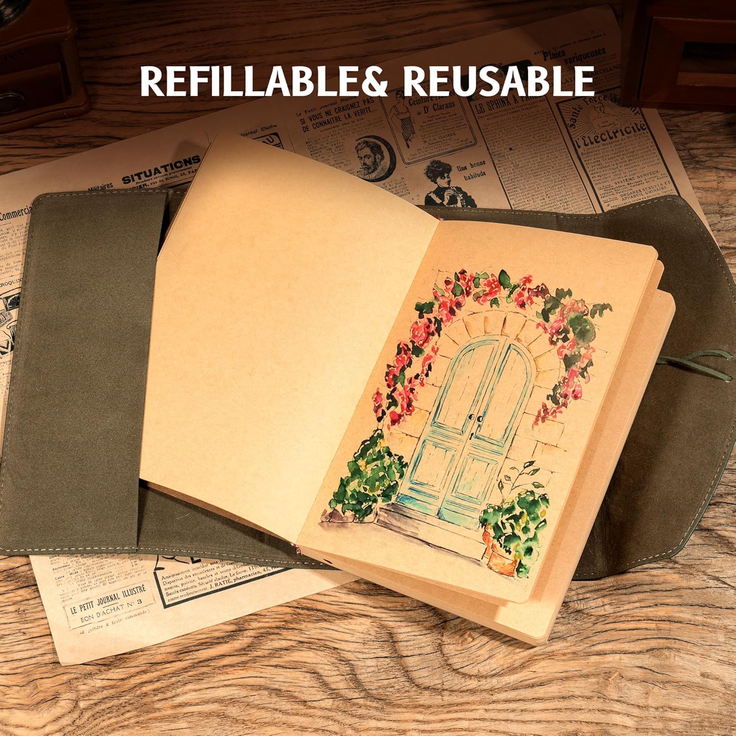 - REFILLABLE& REUSABLE: Unique fillable design, you can fill it with fresh paper to begin a new adventure! Reusable as a travel journal, junk journal, book of shadows, artist's sketchbook, a beautiful drawing/painting journal, writing diary.