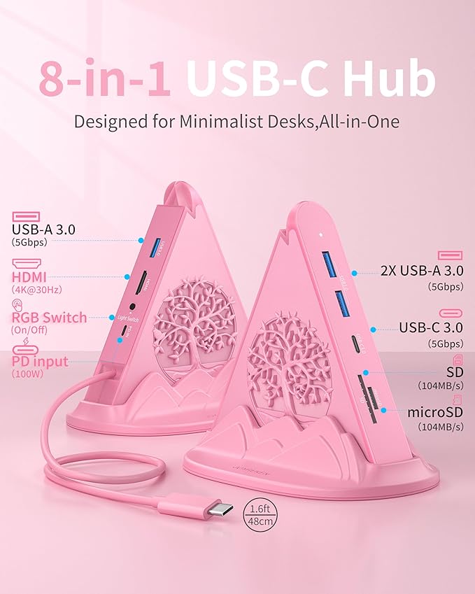 - 8-in-1 Vertical USB-C Hub with RGB: Equipped with a 4K@30Hz HDMI port, a high-speed 5Gbps USB-C data port, 3 x 5Gbps USB-A 3.0 ports, a 100W PD port, an SD/MicroSD card reader, and RGB lighting that supports dynamic color modes. This pink docking station boasts a sleek and ambiance-enhancing design. Its 1.6ft (48cm) USB-C cable provides ample length for laptop setups, while the vertical design maximizes desk space.