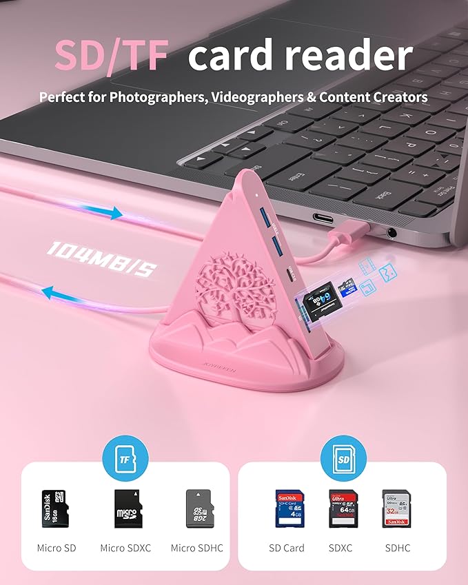 - Fast Data Transfers: Transfer 5GB files in just 3 seconds, with speeds of up to 5Gbps on USB-C/USB-A ports (10x faster than USB 2.0 speeds) and 104Mbps on SD/microSD cards. Photographers, videographers, and content creators will especially appreciate the time saved by this pink USB-C hub with SD card reader when transferring large photo albums, videos, or creative projects.