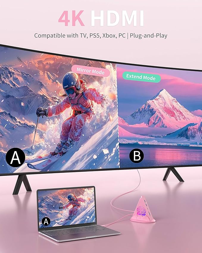 - Ergonomic & Compatible Design: The Tree 8-in-1 Pink USB C desktop Hub has an ergonomic design for easy plugging/unplugging.It’s plug-and-play (no drivers needed), compatible with Windows, macOS, Chrome OS, iPadOS, Android, and works with devices like MacBook Air/Pro, iPad, Surface Pro, Chromebook, Dell XPS, Lenovo, Samsung, Nintendo Switch, PS5, Xbox Series X/S, and more full-functional type-c devices.