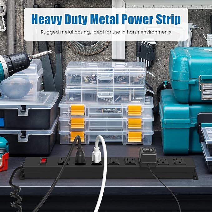 HHSOET 8 Outlet Metal Wall Mount Power Strip, Mountable Outlet with Switch, Heavy Duty Wide Spaced Surge Protector, 4 FT SJT 14AWG Black Spring Cord.