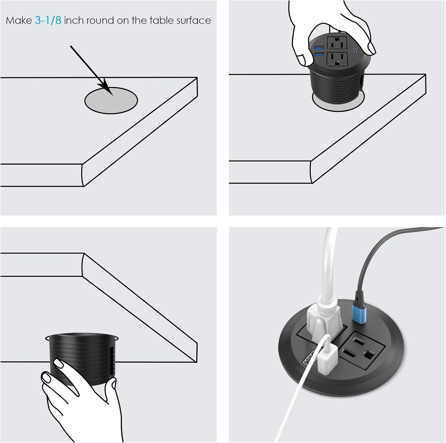 - [EASY TO INSTALLING]:Fits 3 inch Standard Grommet Hole: Make a 3 inch hole on the table surface or you can use the existing cable hole on your desk.Then you can insert the power grommet through.