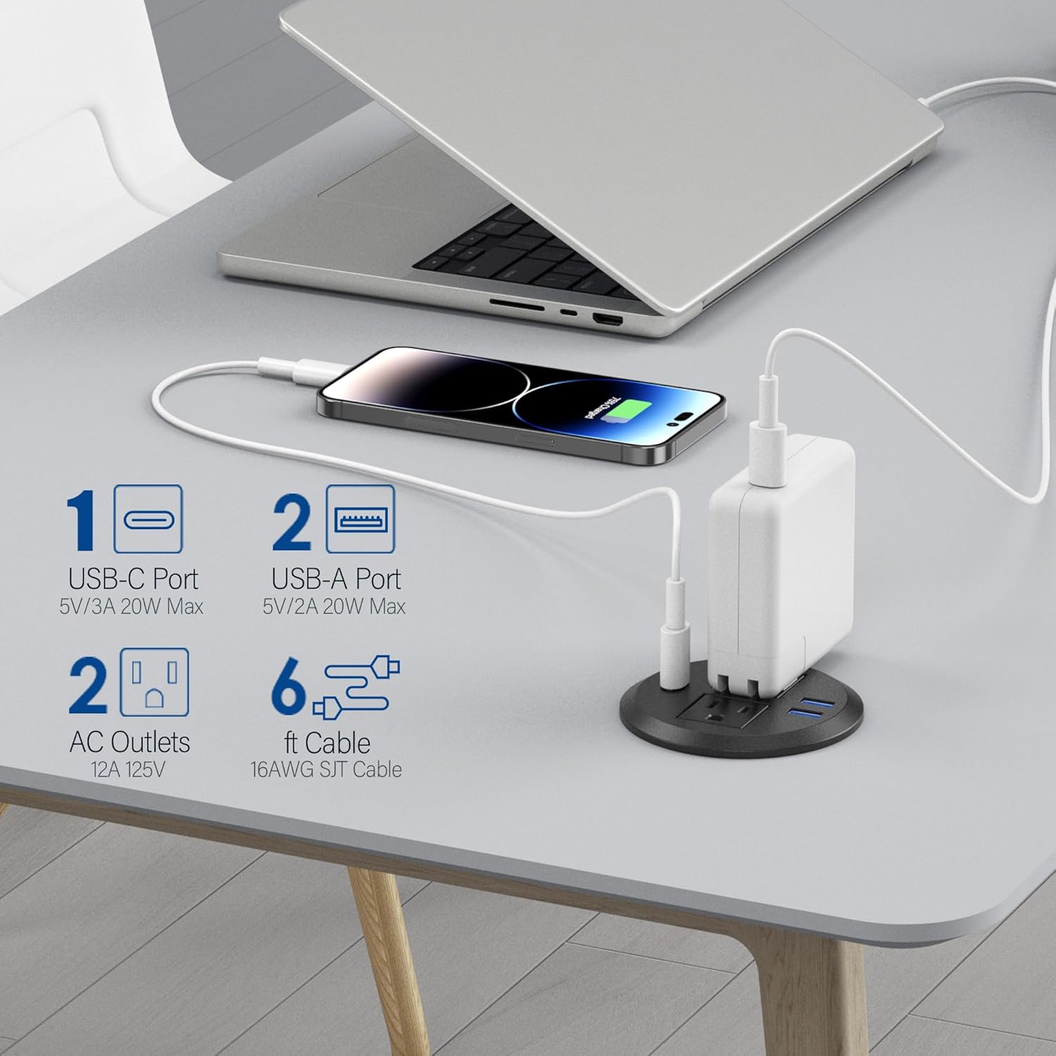 - [Desk Hole Grommet with PD 20W USB-C]: Built-in USB-C charging port on the top of the desk power strip.