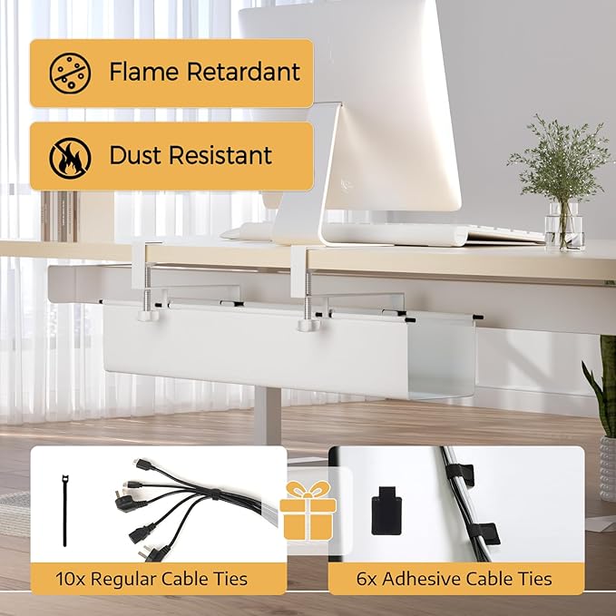 - PREMIUM FABRIC MATERIAL: Our cable management tray is made of premium fabric material that is dust-resistant and fire-retardant, sturdy iron bar support with a load capacity of 25LBS, maximizes the safety of the internal wires and keeps dust out. Desk cord organizer long: 69cm/27.2 inches.