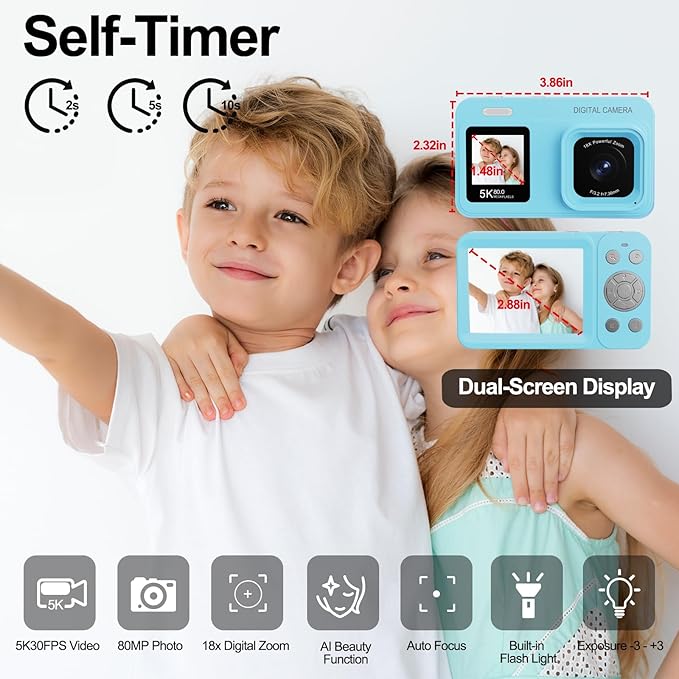 - UPGRADED 5K DUAL SCREEN DIGITAL CAMERA - Featuring 5K80MP high resolution, dual screen, autofocus, 18x digital zoom, face beauty function, and built-in flash