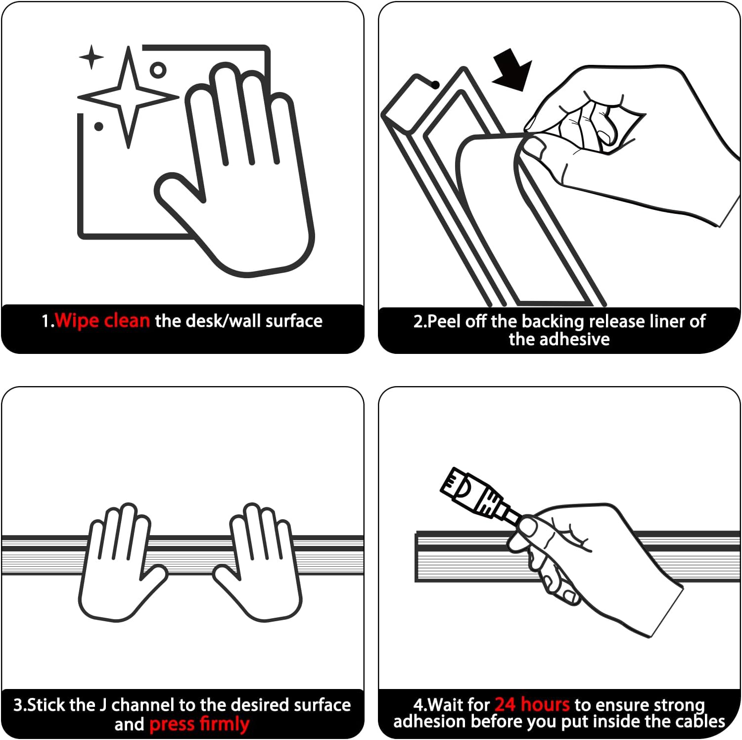 - Flexible Placement, Multiple Applications - Whether hiding wires under a desk or organizing cables alongwall, the J channel desk wire management offers diverse placement options. Installation is straightforward: choose a spot, peel off the film, and press the J channel pc cable management firmly onto the desired location. Let the J channel desk cable organizer set for 24 hours for a strong bond. Note that powder walls or uneven surfaces may hinder tape adhesion