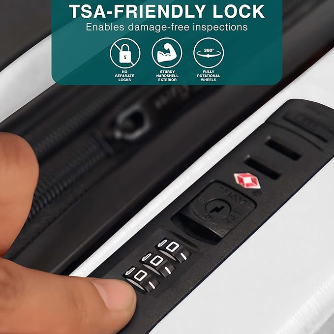 - Travel Suitcase with Wheels: Hardshell luggage sets like this white luggage set, that include rolling suitcases with wheels, are perfect for your travel needs as they include a large luggage suitcase, and a medium size suitcase.