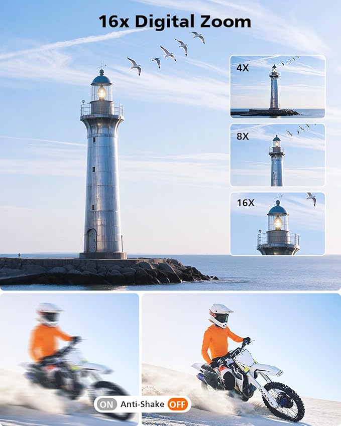 - 【Feature-Rich & Pocket-Size】This compact digital camera fits in your pocket but offers big features for any occasion. Choose from Auto, Portrait, Night, or Landscape modes to match every scene. Zoom in with 16X digital zoom, add artistic flair with fun filters, brighten scenes with the built-in flash, and keep shots steady with anti-shake. A point and shoot digital camera perfect for travel, gifts, or everyday use—ideal for beginners and hobbyists who love camera for photography