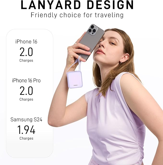 VINKO Portable Charger Power Bank with Built-in Cables, 22.5W Fast Charging 10000mAh Phone Charger, Small Travel Battery Pack with Smart LED Display for iPhone, Android & USB-C Devices(Purple)