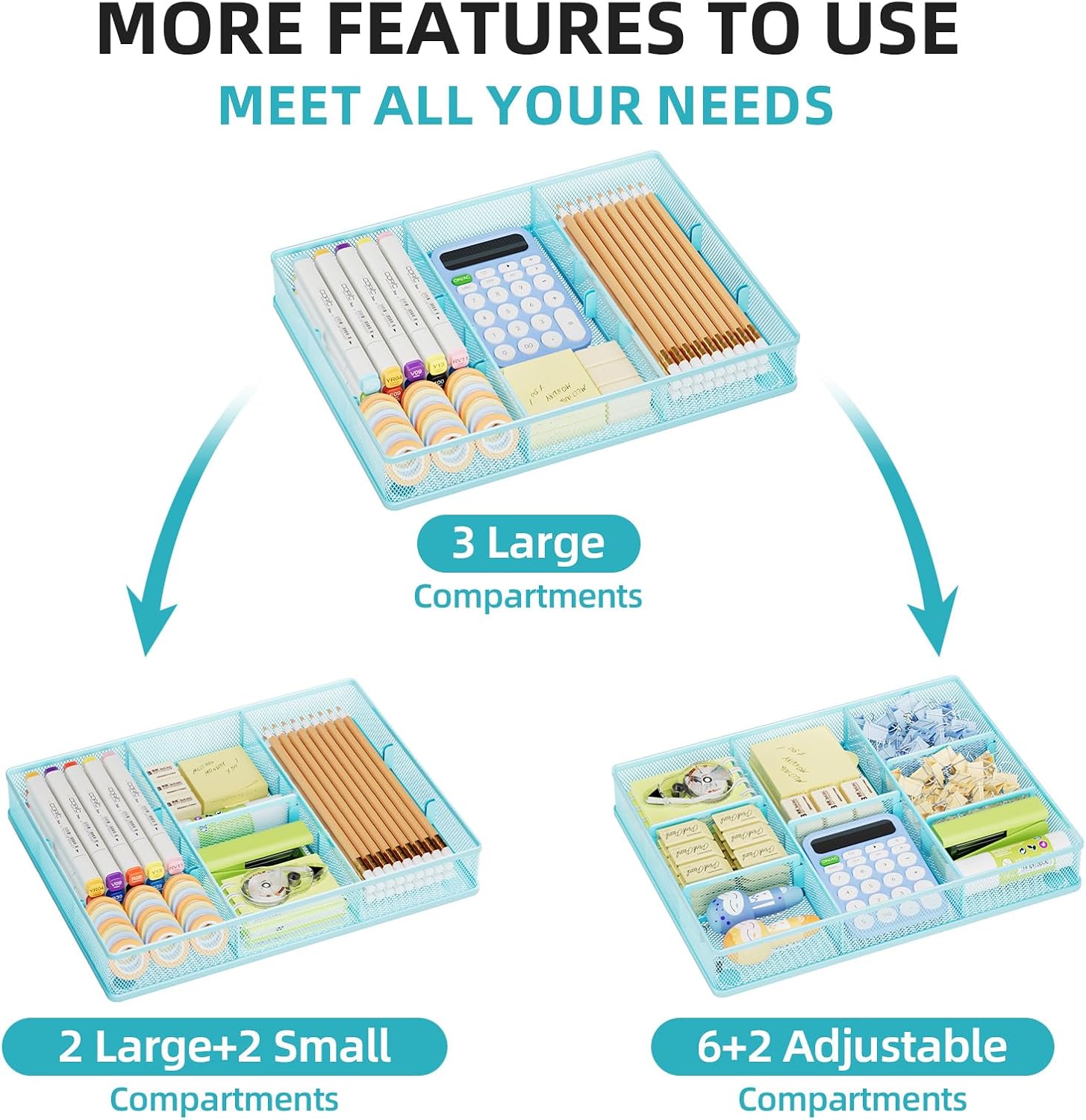 - Adjustable Dividers: The 5 adjustable dividers can be combined to fit variously sized desk accessories, such as pens, erasers, highlighters, notes, staplers, tapes, clips, or other supplies. Large Drawer: 12 x 8.5 x 1.8 inches. Medium Drawers: 4.5 x 3.8 x 1.8 inches, Small Drawers: 4 x 3 x 1.8 inches.