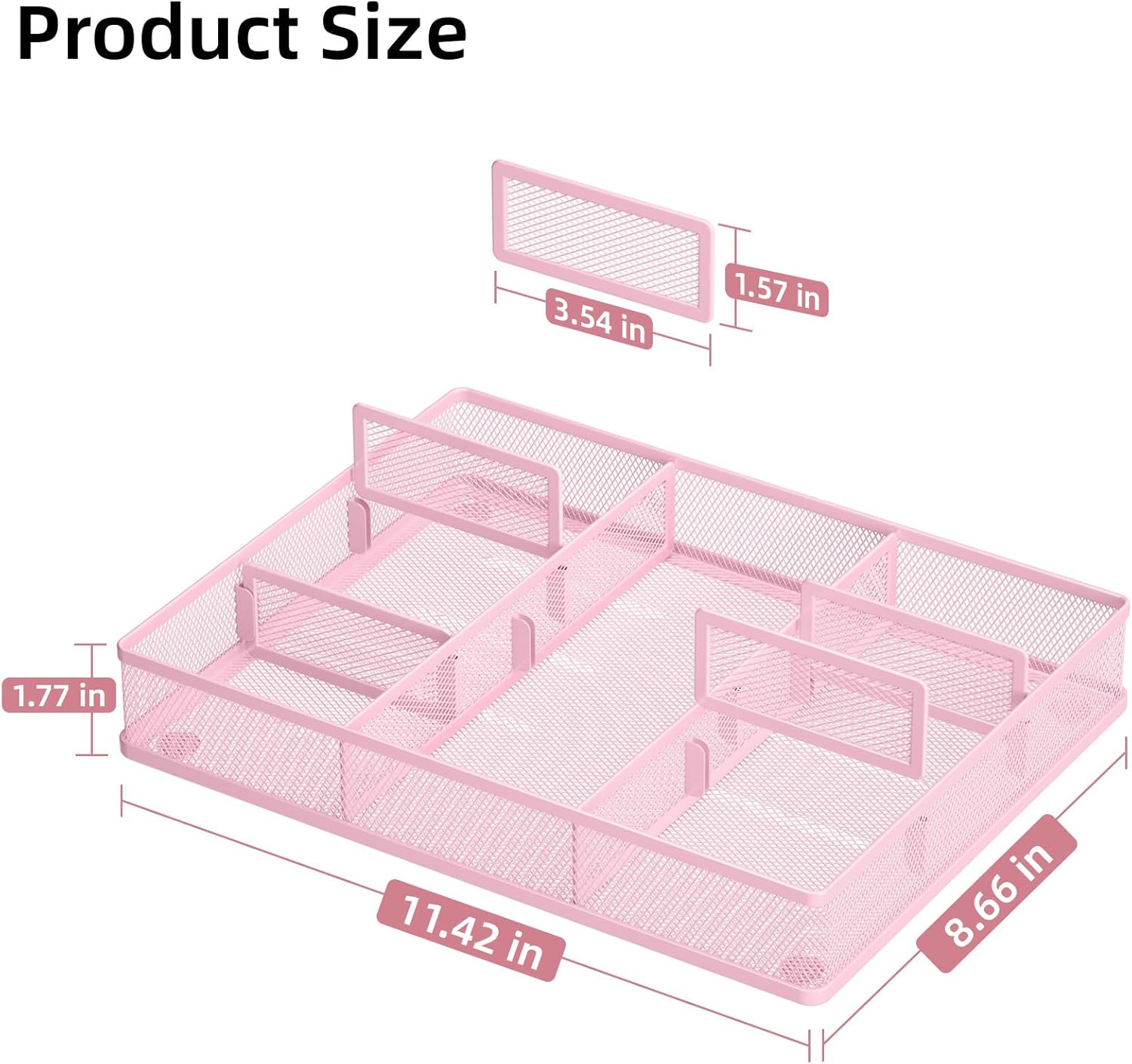 Marbrasse Pink Desk Drawer Organizer, Metal Mesh Drawer Organizer Tray with 5 Adjustable Compartments,Desk Organizers and Accessories for Home,Office,Kitchen,Makeup,Vanity (Pink)