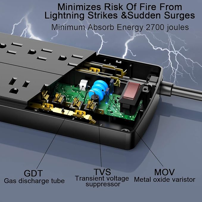 - 【12 AC Surge Protector Outlets】- The 3 level complementary Surge Protector Circuit which composed of TVS (transient voltage suppressor), MOV (metal oxide varistor), GDT (gas discharge tube), with minimum 2700 Joules energy absorbing capacity, could protect your devices much more quickly and reliably than other brand's 1 level MOV Surge Protection Circuits.