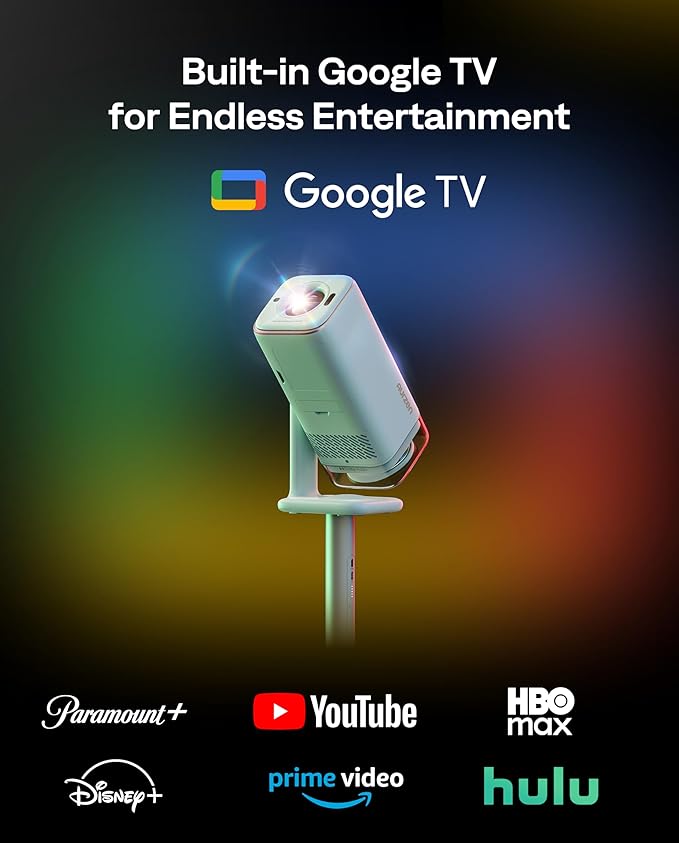 - Special Feature : Portable Smart Projector with Built-in Google TV for Truly Unlimited Content, Portable Projector for Outdoor Movie Nights with USB-C Powered (requires a power bank with 65W+ output), 110° Flexible Tilting Gimbal Stand, 4k Projector with 300 ANSI Lumens & True 1080p Resolution(4K Supported), ToF Real-time focus & Keystone Correction, Movie Projector with Bluetooth and WiFi, DoIby Audio & 10W Visible Speakers Portable Smart Projector with Built-in Google TV for Truly Unlimited Content, Portable Projector for Outdoor Movie Nights with USB-C Powered (requires a power bank with 65W+ output), 110° Flexible Tilting Gimbal St… See more