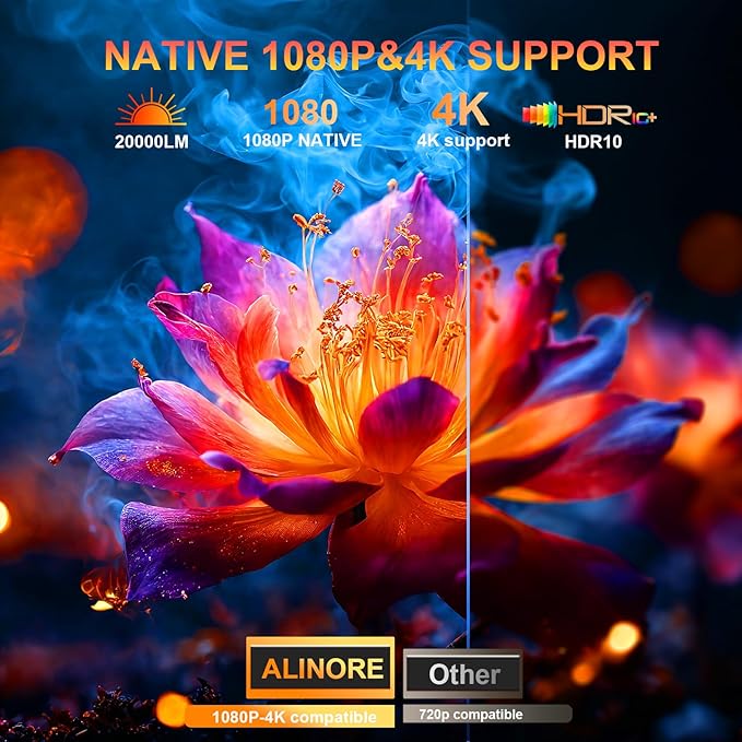 - 【Native 1080P Resolution & 4K Support】FULL HD 1080P projector provides true 1080P resolution and 4K HDR support, bringing ultra high definition content to life with excellent clarity. Whether you need a projector to watch movies or for presentations and meetings, ALINORE movie projector is the perfect choice. Mini projector adapted advanced HDR technology and precise optical components to produce bright highlights, vibrant colors, and clear details.