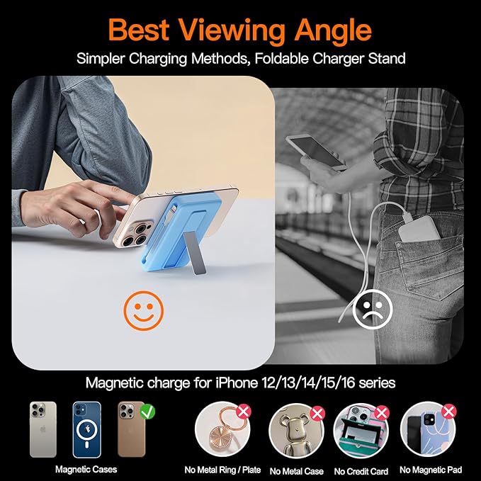 - Strong magnetic attraction:Equipped with a built-in powerful N52 magnetic coil, designed specifically for Magsafe battery packs, perfectly aligned with the Magsafe iPhone 17/16/15/14/13/12 series. Even during outdoor activities, it will firmly adhere to the phone without slipping off, ensuring your safety. When charging, simply lightly align the phone magnetic coil with the battery pack for wireless charging