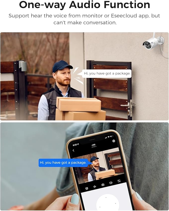 - 【Night Vision & One-Way Audio】 4K NVR + 5MP cameras capture sharp details even in darkness, eliminating blind spots. Surveillance camera system enhance security measures with the listen in real-time without revealing your presence-no accidental mic leaks or unwanted attention.