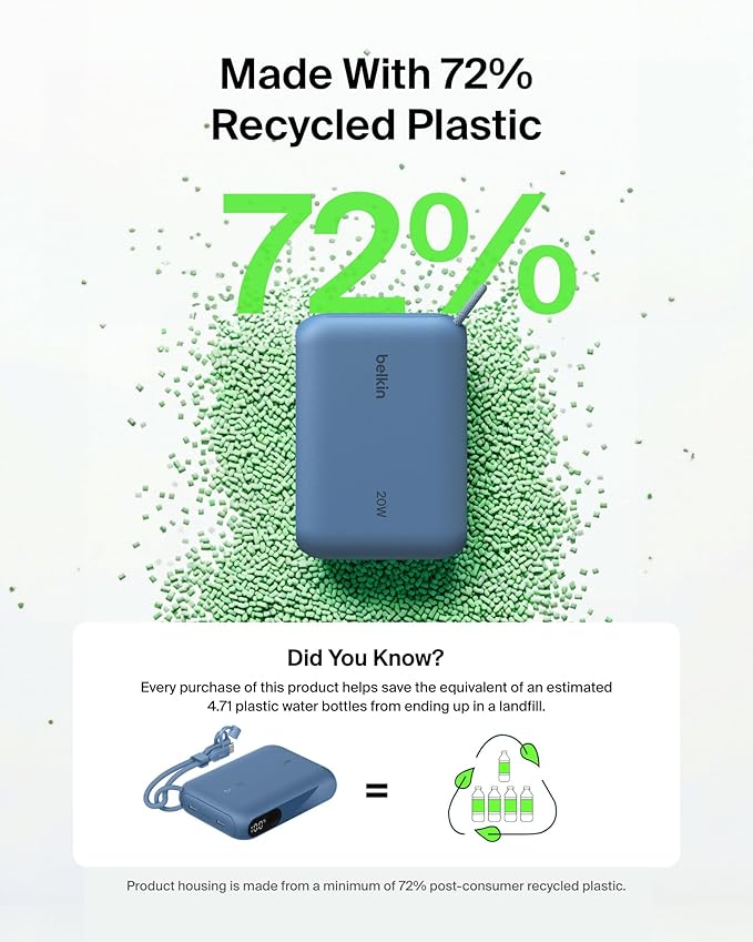 Belkin Portable Charger, Slim USB-C Power Bank 10,000mAh w/ 2 USB-C Ports, Digital Battery Display, 20W Charging Battery Pack - iPhone 17, Air, Pro, Samsung Galaxy S25, Pixel 10, iPad, & More - Blue