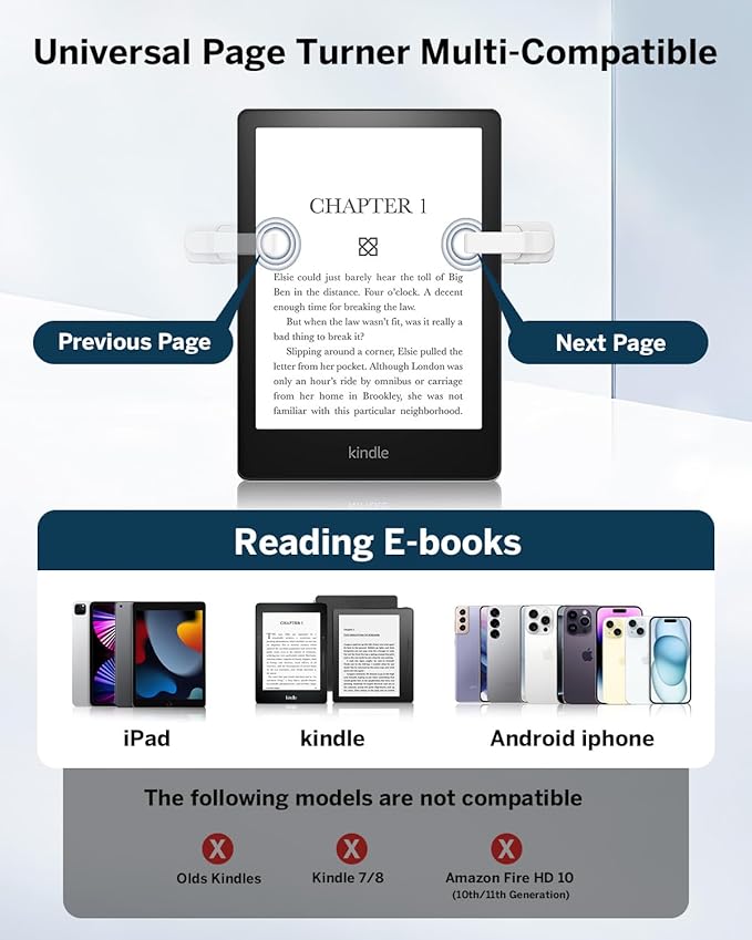 - Ergonomic Page Turner Ring: New exterior design, freeing your hands. Page turners for a wide range of capacitive screen devices. With the page turning remote control, no need to continuously touch the Kindle screen to flip pages. Simply press the button for remote page flipping. Page turner be designed with mute button,when you reading in the night,will not noise others. Adapt to multiple platforms, Kindle, Kindle Paperwhite, Kindle Oasis, Kindle Kids Edition, Kindle Voyage, Android Tablets, Surface, Kobo, iPhone iPad page turner. (Incompatible Devices: Kindle 7/8th Generation, Amazon Fire HD 10 (10th/11th generation)