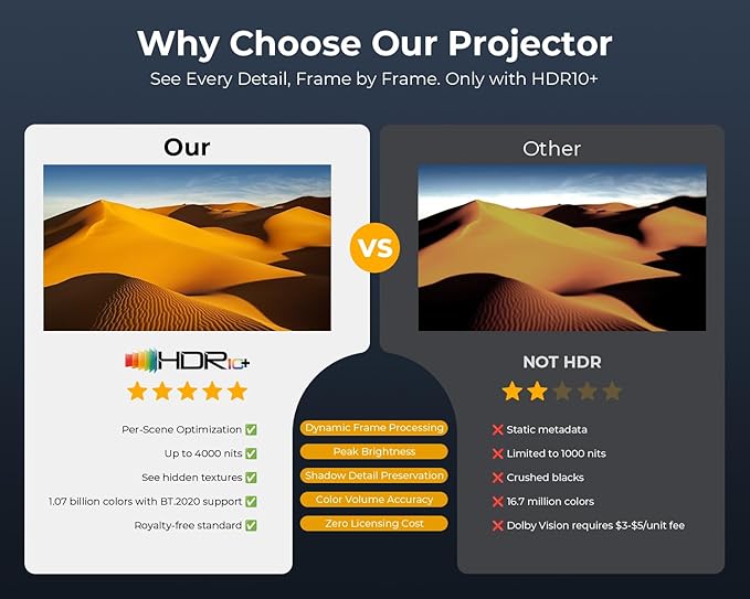 - Special Feature : 【1200 ANSI Lumens w/ 4K PRO-UHD】【NETFLIX-Licensed】【Dolby Audio】【Smart AI 2.0 True-Color Engine 】【Sealed Optical Engine】【Auto Focus/Keystone Correction/Screen Alignment/Obstacle Avoidance】【Two-Way Bluetooth 5.2】【Dual-Band 2.4G+5G WiFi】【2*15W Hi-Fi Speakers】 【1200 ANSI Lumens w/ 4K PRO-UHD】【NETFLIX-Licensed】【Dolby Audio】【Smart AI 2.0 True-Color Engine 】【Sealed Optical Engine】【Auto Focus/Keystone Correction/Screen Alignment/Obstacle Avoidance】【Two-… See more