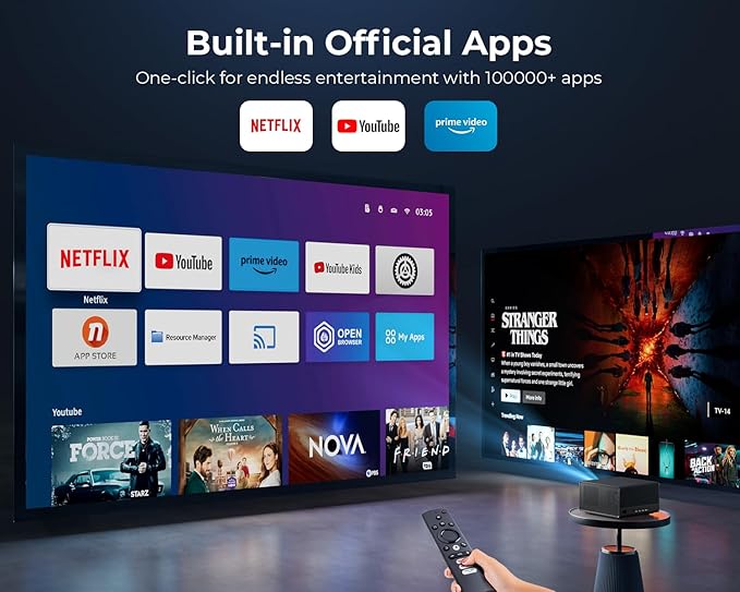 - 【Netflix-Licensed, Prime Video and YouTube Built-in】Enjoy direct access to licensed apps like Netflix, Amazon Prime Video, and YouTube with the built-in "App Store." No need for extra devices or complicated setups! Plus, with dedicated buttons on the remote, you can instantly launch your favorite streaming platforms for a hassle-free movie night.
