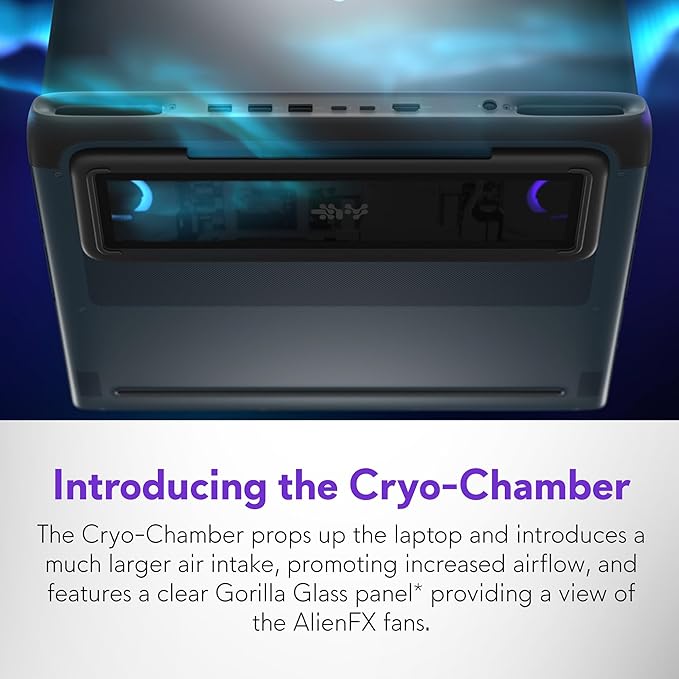 - Introducing the Cryo-Chamber: The Cryo-Chamber props up the laptop and introduces a much larger air intake, promoting increased airflow, and features a clear Gorilla Glass panel* providing a view of the AlienFX fans.