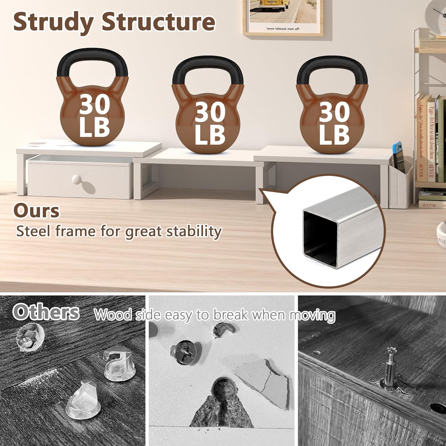 - [Sturdy and Durable] This monitor stand is made of high-quality metal and particle board, each board can bear 66 pounds to meet your daily needs, and the bottom of the monitor riser is equipped with a grid-shaped rubber gasket, which can effectively prevent the product from sliding, making the desktop storage more firm and stable