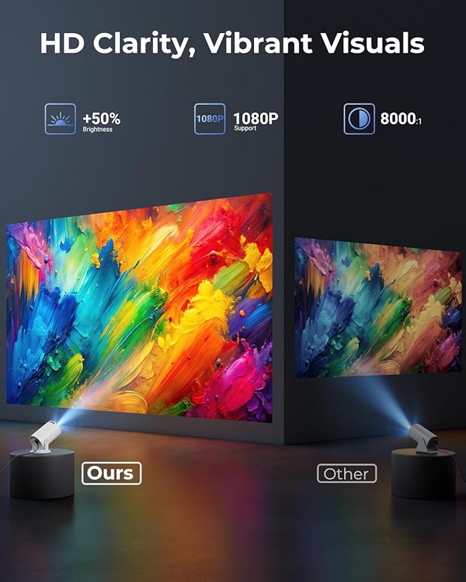 - Built-in Streaming Apps & Versatile Connectivity: Stream YouTube, Disney+, and more with built-in apps—just connect to Wi-Fi and enjoy, no extra devices needed. This projector supports both wireless mirroring and wired connections for phones, tablets, and laptops. HDMI and USB ports let you easily connect game consoles, Fire Stick, or computers—perfect for home entertainment, family sharing, or on-the-go projection