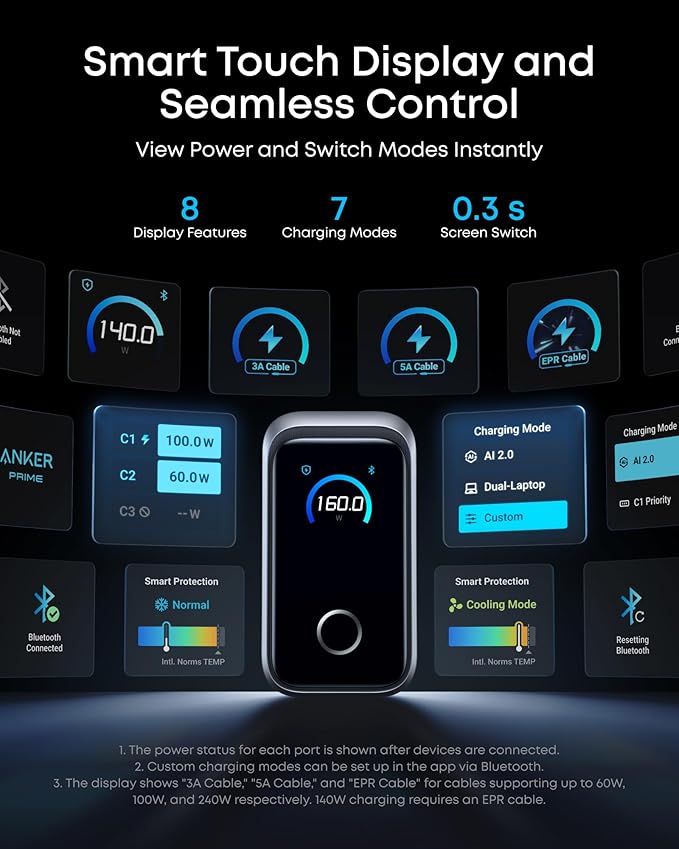 Anker Prime Charger, 160W 3-Port Compact USB C GaN Charger Block, Smart Display and Touch Control, 140W Max Charging via Any Single Port, for MacBook, Laptop, iPhone 17/16/15 Series, iPad(Non-Battery)